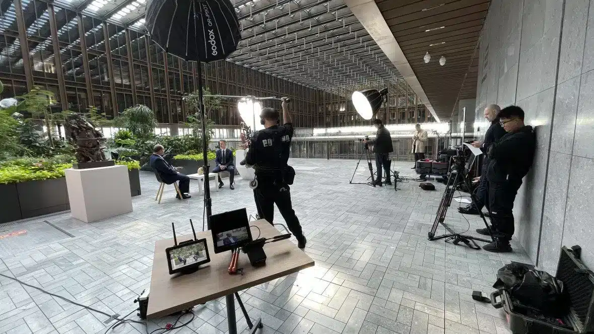 • Supplying industry-leading equipment: Sony FX3 cameras for crisp interview footage, Aputure lighting to balance AIIB’s interior spaces, and Sennheiser audio tools for crystal-clear dialogue.